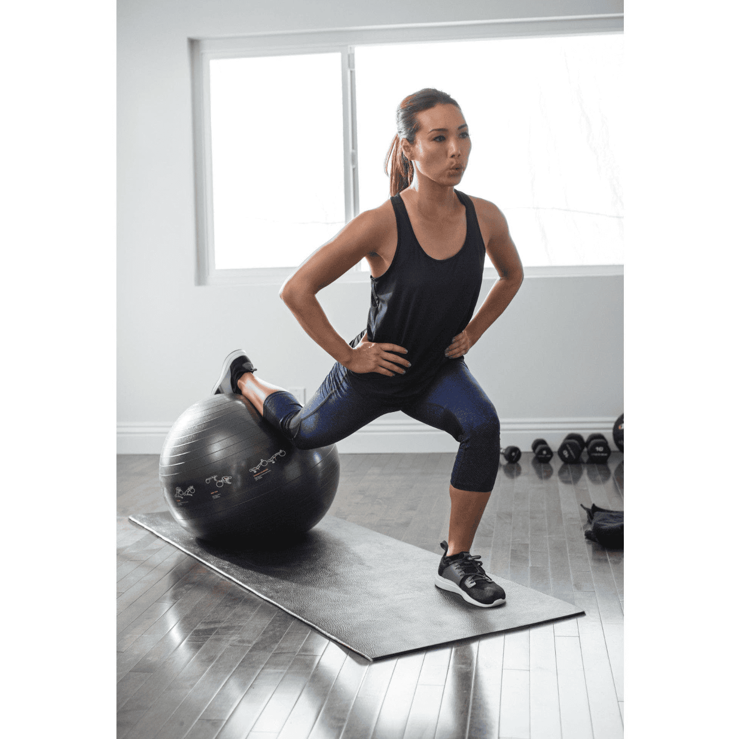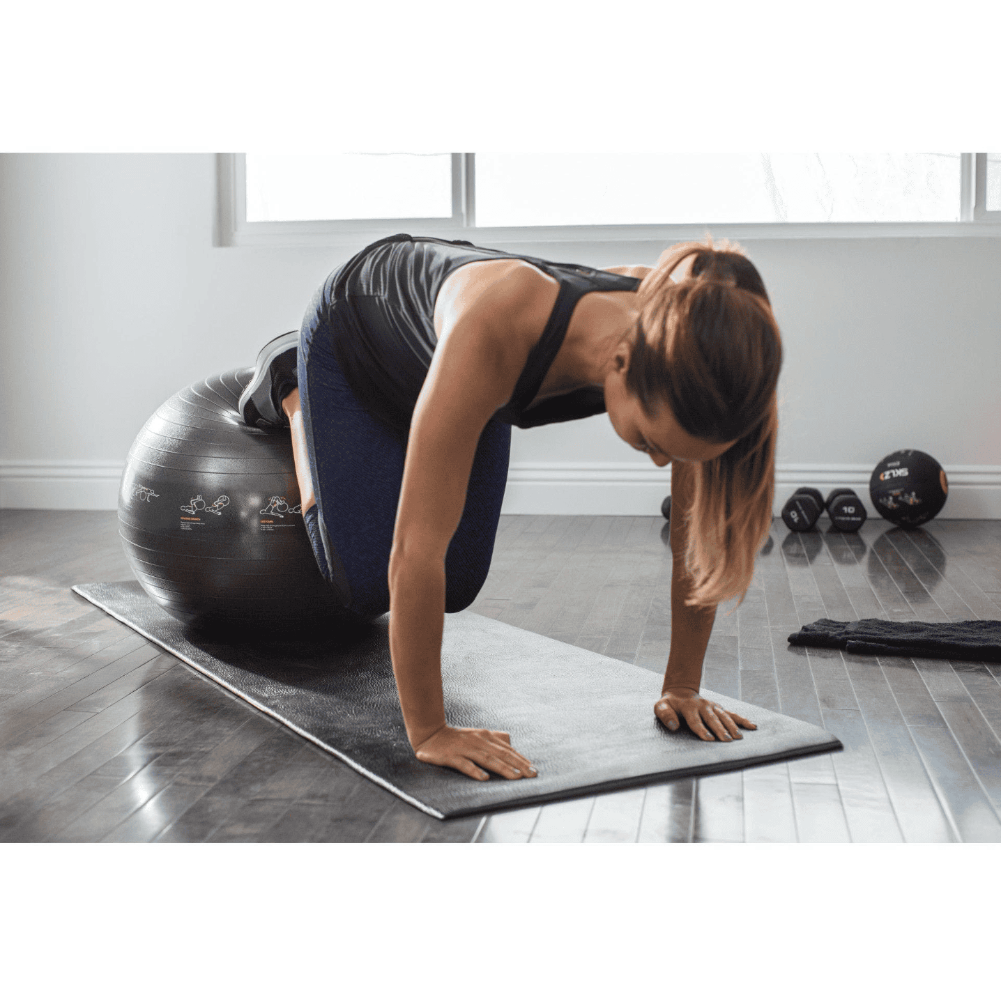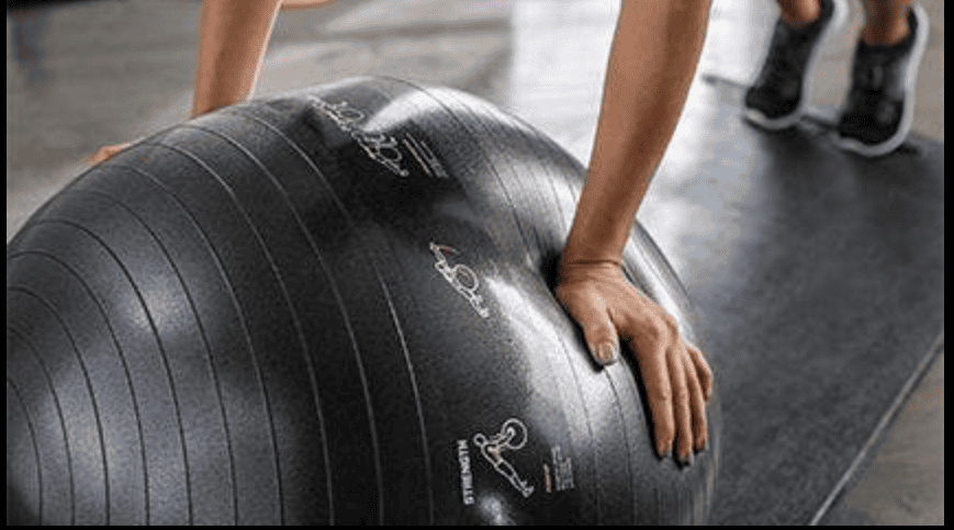 כדור אימון דינמי המודפסים על פניו תרגילים, חזותים למקוד למיצוי אימון גוף‑שלם — כולל משאבת אוויר ונבדק לעומסים של עד 2,000 ק"ג.
