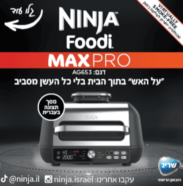 נינג'ה גריל MAX PRO ׀ "על האש" בתוך הבית, בלי כל העשן מסביב. מערכת בישול חכמה שצולה, אופה ומטגנת בלי ניחושים ולתוצאות מדויקות עם פאנל תצוגה בעברית (בלעדי) חדש! קחו את יכולות הגריל שלכם לרמה חדשה עם אפשרות לצלייה גם עם מכסה פתוח ועם פלטה שטוחה לצריבה והקפצה.