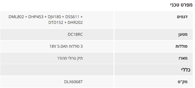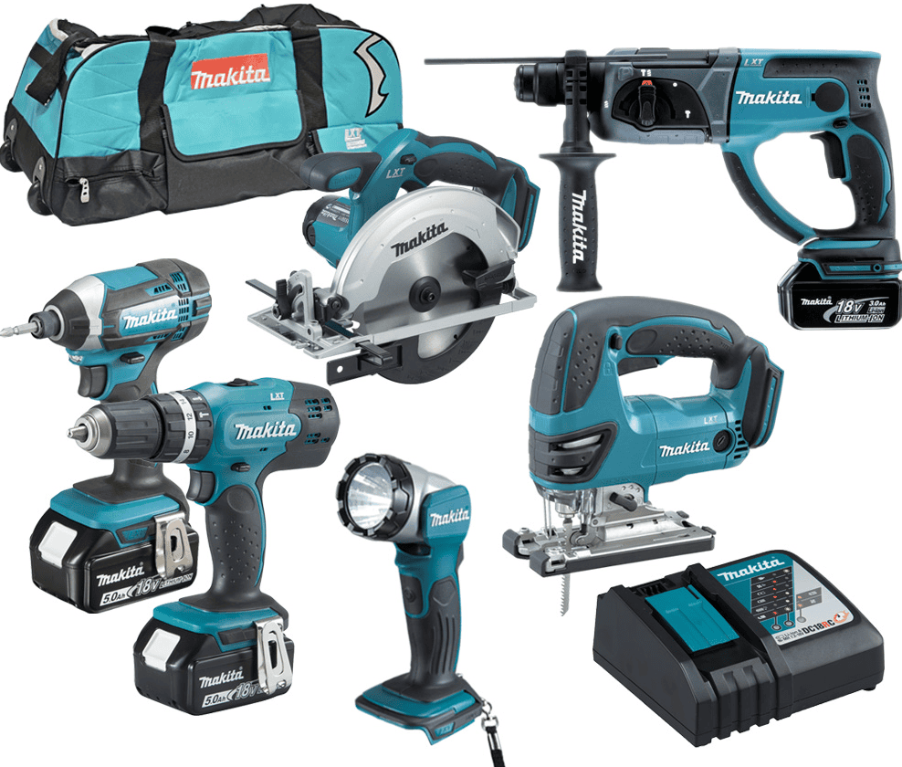 הסט המרשים כולל 6 כלים נטענים מסדרת ה-18V LXT, שלוש סוללות 5.0Ah ומטען מהיר – לקבלת עצמאות מרבית ועוצמה בלתי מוגבלת. הערכה מכילה את הפריטים הבאים: פטישון קידוח DHR202Z – 2.0J מקדחה / מברגה DHP453Z – 13 מ"מ מברגת אימפקט DTD152Z – 165Nm מסור אנכי DJV180Z – 26 מ"מ מסור עגול DSS611Z – "6.5 פנס לד נטען DML802